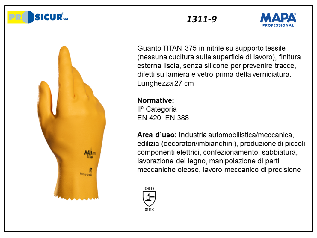 Guanto MAPA TITAN 375 in nitrile su supporto tessile , finitura esterna liscia, senza silicone per prevenire tracce, difetti su lamiera e vetro prima della verniciatura. Taglia 9