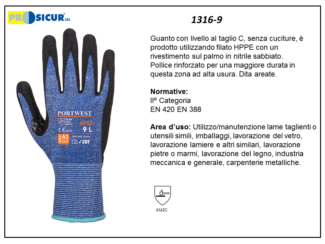 1316-9 – (Quantità per Confezione: 12 PA) – Guanto hppe/fibra vetro rives.nitrile sabbiato dorso areato
