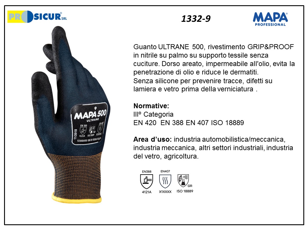 Guanto MAPA ULTRANE 500, rivestimento GRIP&PROOF in nitrile su palmo su supporto tessile senza cuciture. Dorso areato, impermeabile all’olio, evita la penetrazione di olio e riduce le dermatiti.