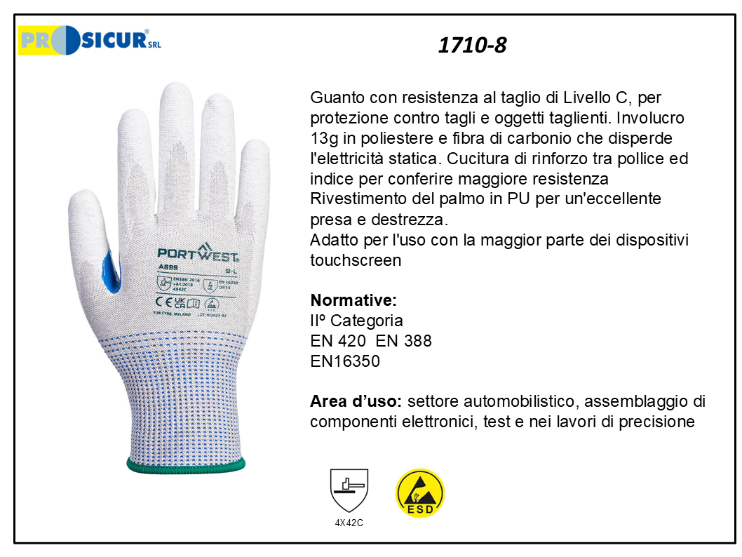 1710 – (Quantità per Confezione: 12 PA) – Guanto esd resistenza taglio cpes e fibra carbonio rivest.pu