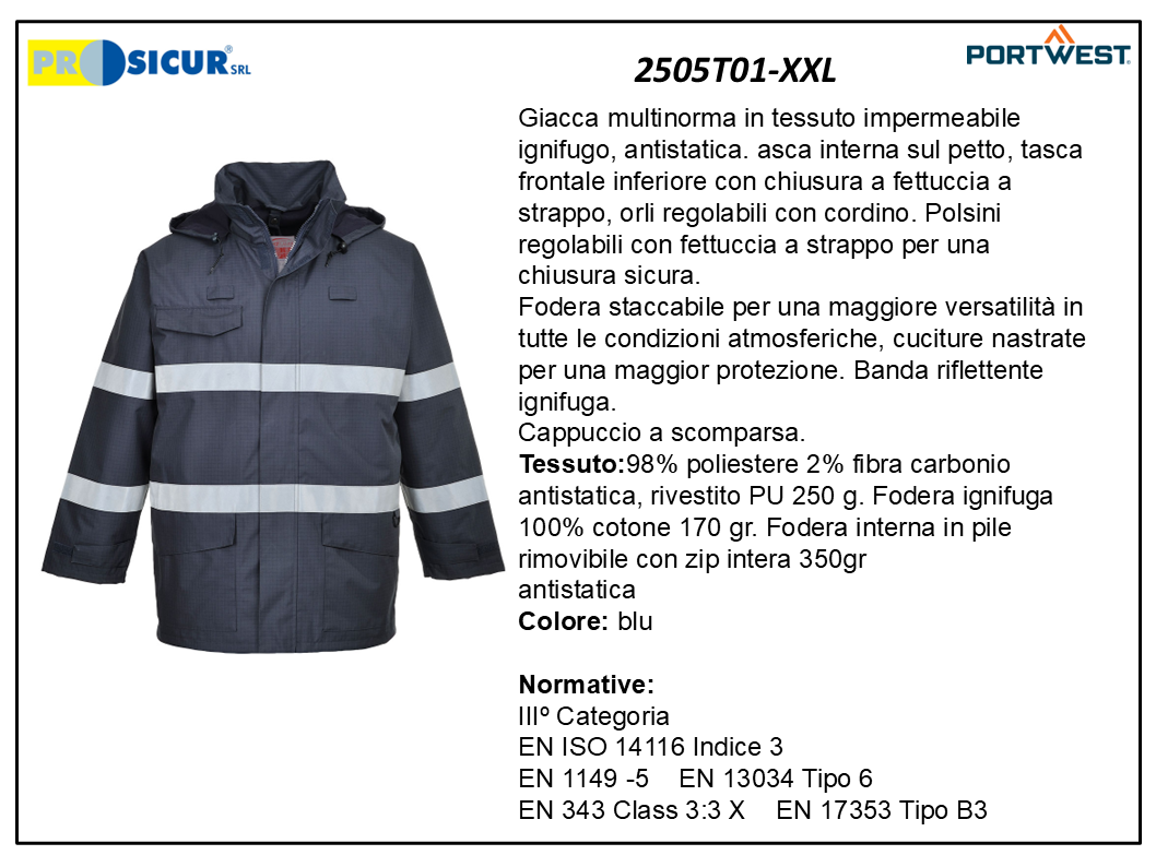 Giacca PORTWEST S770 multinorma in tessuto impermeabile ignifugo, antistatica. asca interna sul petto, tasca frontale inferiore con chiusura a fettuccia a strappo, orli regolabili con cordino. Polsini regolabili con fettuccia a strappo per una chiusura sicura.