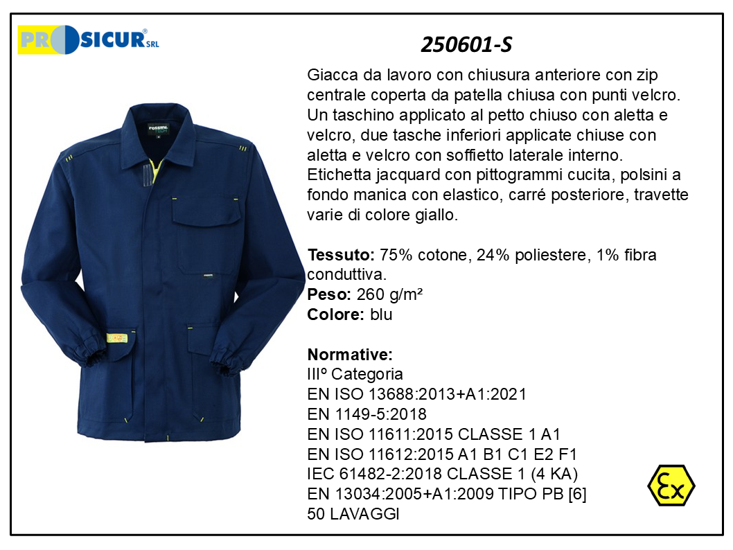 Giacca da lavoro IGNIFUGA ANTIACIDO ANTISTATICA con chiusura anteriore con zip centrale coperta da patella chiusa con punti velcro. Un taschino applicato al petto chiuso con aletta e velcro, due tasche inferiori applicate chiuse con aletta e velcro con soffietto laterale interno. Etichetta jacquard con pittogrammi cucita, polsini a fondo manica con elastico, carré posteriore, travette varie di colore giallo. Tessuto:79% cotone, 20% poliestere, 1% fibra conduttiva. Peso: 260g/m² IIIº Categoria