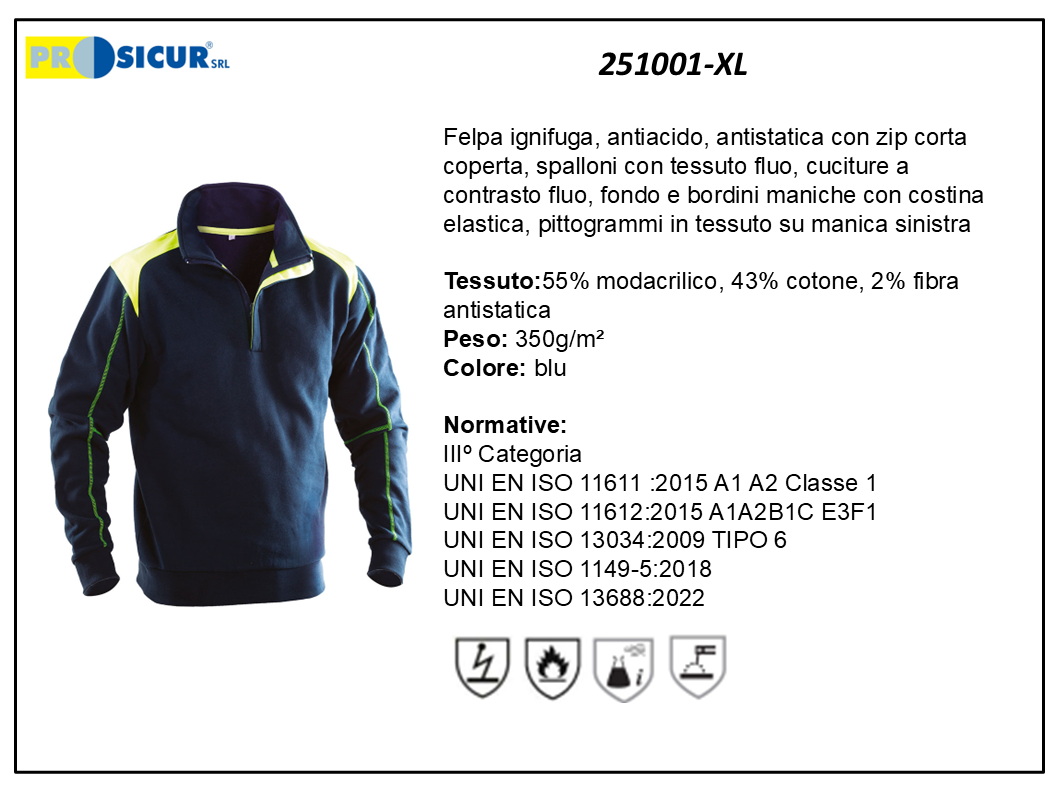 Felpa IGNIFUGA ANTIACIDO ANTISTATICA con zip corta coperta, spalloni con tessuto fluo, cuciture a contrasto fluo, fondo e bordini maniche con costina elastica, pittogrammi in tessuto su manica sinistra. Tessuto: 55% modacrilico, 43% cotone, 2% fibra antistatica Peso: 350 g/m² . IIIº Categoria UNI EN ISO 11611 :2015 A1 A2 Classe 1 UNI EN ISO 11612:2015 A1A2B1C E3F1 UNI EN ISO 13034:2009 TIPO 6 UNI EN ISO 1149-5:2018 UNI EN ISO 13688:2022 . Colore blu Taglia: XL