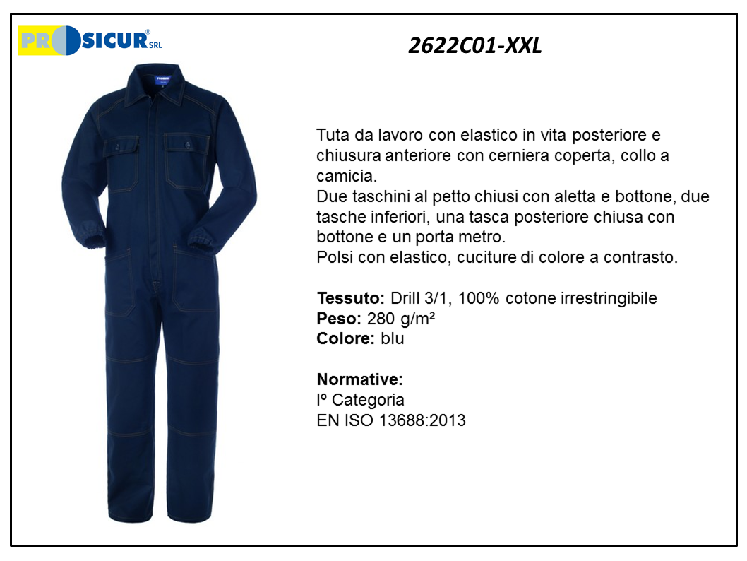 Tuta da lavoro Drill 3/1, 100% cotone irrestringibile, 280 g/m² con elastico in vita posteriore e chiusura anteriore con cerniera coperta, collo a camicia. Due taschini al petto chiusi con aletta e bottone, due tasche inferiori, una tasca posteriore chiusa con bottone e un porta metro. Polsi con elastico, cuciture di colore a contrasto. Iº Categoria EN ISO 13688:2013. Colore blu, taglia XXL