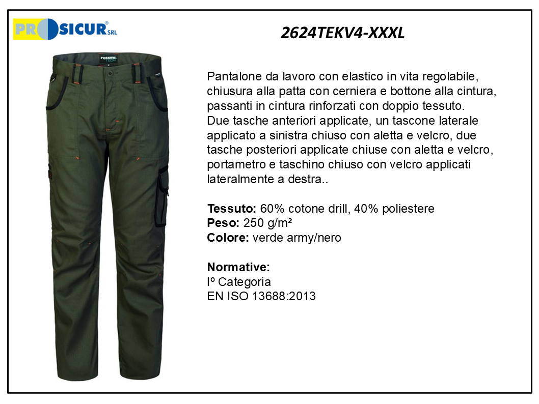 Pantalone da lavoro 60% cotone drill, 40% poliestere – Peso: 250 g/m², con elastico in vita regolabile, chiusura alla patta con cerniera e bottone alla cintura, passanti in cintura rinforzati con doppio tessuto. Due tasche anteriori applicate, un tascone laterale applicato a sinistra chiuso con aletta e velcro, due tasche posteriori applicate chiuse con aletta e velcro, portametro e taschino chiuso con velcro applicati lateralmente a destra. Iº Categoria EN ISO 13688:2013. Colore verde army/nero, taglia XXXL