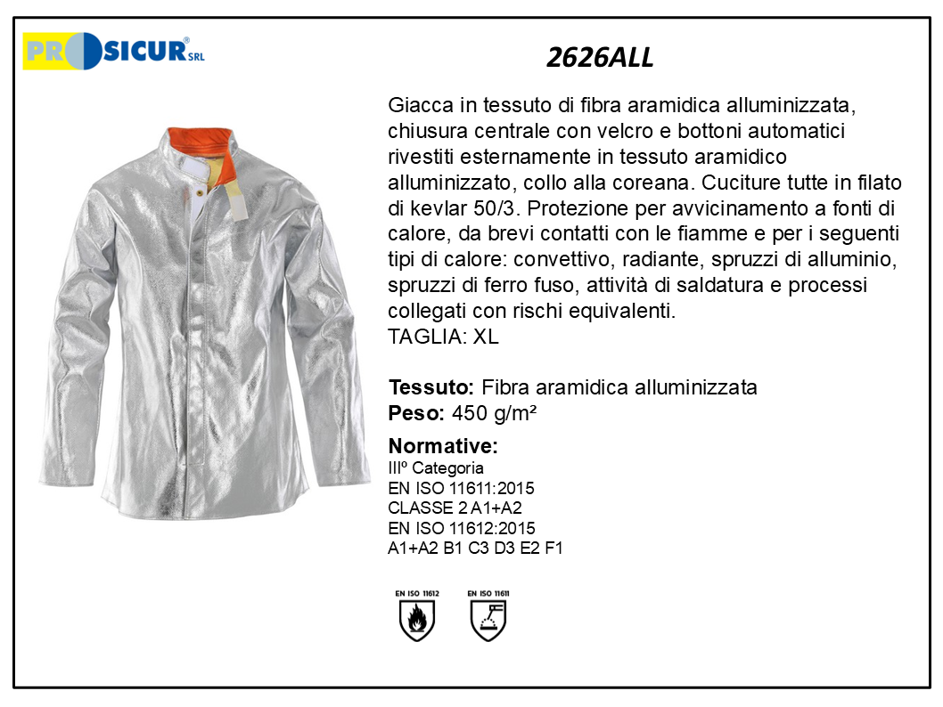 Giacca in tessuto di fibra aramidica alluminizzata peso 450 g/m² chiusura centrale con velcro e bottoni automatici rivestiti esternamente in tessuto aramidico alluminizzato, collo alla coreana. Cuciture tutte in filato di kevlar 50/3. Protezione per avvicinamento a fonti di calore, da brevi contatti con le fiamme e per i seguenti tipi di calore: convettivo, radiante, spruzzi di alluminio, spruzzi di ferro fuso, attività di saldatura e processi collegati con rischi equivalenti.IIIº Categoria IIIº Categoria EN ISO 11611:2015 CLASSE 2 A1+A2