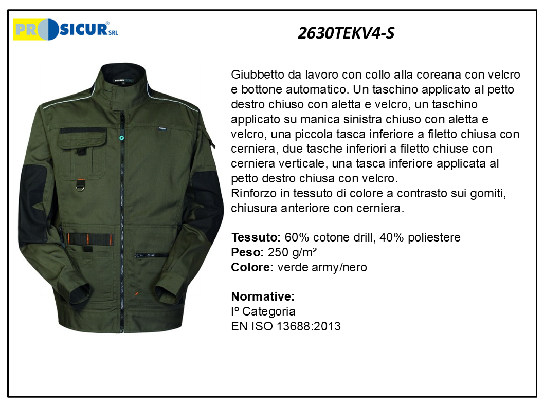 Giubbetto da lavoro 60% cotone drill, 40% poliestere – Peso: 250 g/m², con collo alla coreana con velcro e bottone automatico. Un taschino applicato al petto destro chiuso con aletta e velcro, un taschino applicato su manica sinistra chiuso con aletta e velcro, una piccola tasca inferiore a filetto chiusa con cerniera, due tasche inferiori a filetto chiuse con cerniera verticale, una tasca inferiore applicata al petto destro chiusa con velcro. Rinforzo in tessuto di colore a contrasto sui gomiti, chiusura anteriore con cerniera. Iº Categoria EN ISO 13688:2013. Colore verde army/nero, taglia S