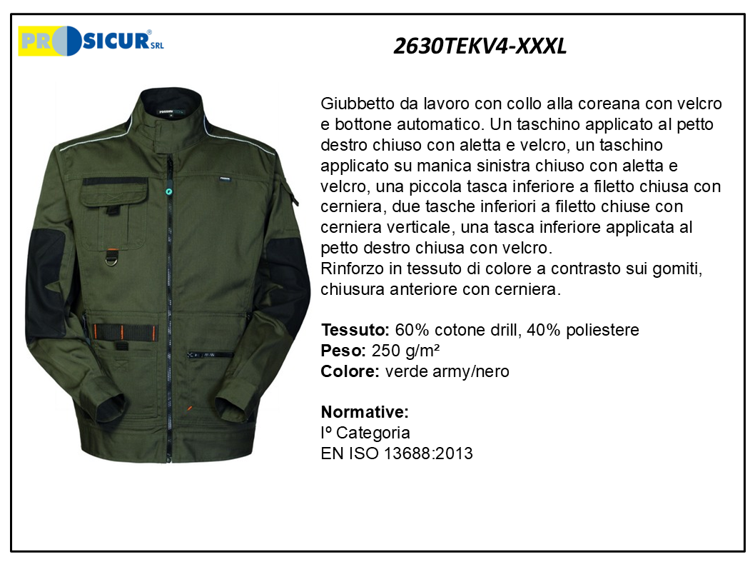 Giubbetto da lavoro 60% cotone drill, 40% poliestere – Peso: 250 g/m², con collo alla coreana con velcro e bottone automatico. Un taschino applicato al petto destro chiuso con aletta e velcro, un taschino applicato su manica sinistra chiuso con aletta e velcro, una piccola tasca inferiore a filetto chiusa con cerniera, due tasche inferiori a filetto chiuse con cerniera verticale, una tasca inferiore applicata al petto destro chiusa con velcro. Rinforzo in tessuto di colore a contrasto sui gomiti, chiusura anteriore con cerniera. Iº Categoria EN ISO 13688:2013. Colore verde army/nero, taglia XXXL