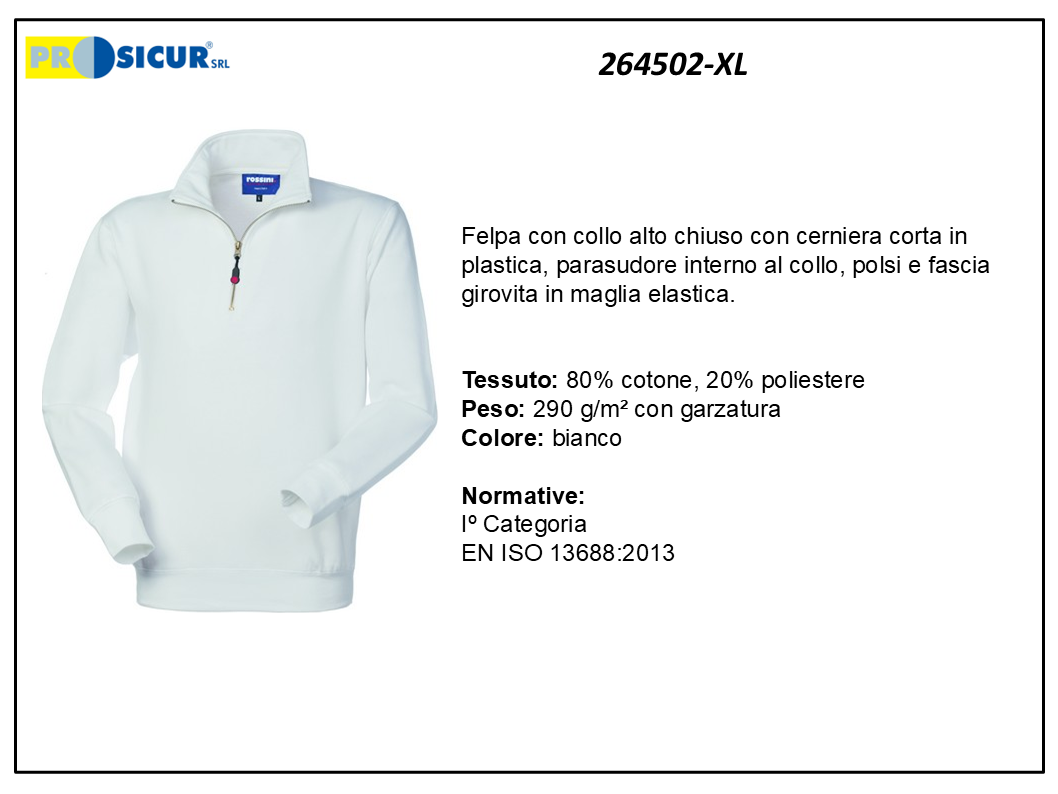 Felpa 80% cotone, 20% poliestere, 290 g/m² con garzatura, con collo alto chiuso con cerniera corta in plastica, parasudore interno al collo, polsi e fascia girovita in maglia elastica. Iº Categoria EN ISO 13688:2013. Colore bianco, taglia XL