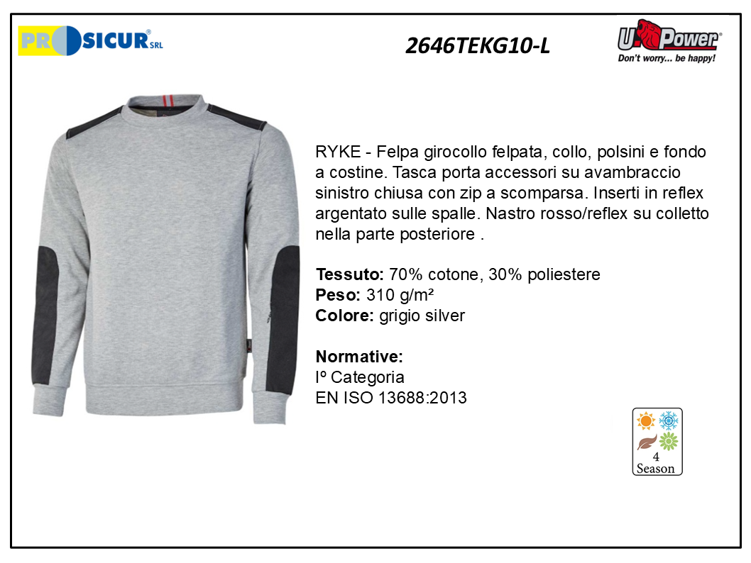 Felpa U-POWER modello RYKE girocollo felpata,70% cotone, 30% poliestere, 310 g/m², collo, polsini e fondo a costine. Tasca porta accessori su avambraccio sinistro chiusa con zip a scomparsa. Inserti in reflex argentato sulle spalle. Nastro rosso/reflex su colletto nella parte posteriore . Iº Categoria EN ISO 13688:2013. Colore grigio silver, taglia L