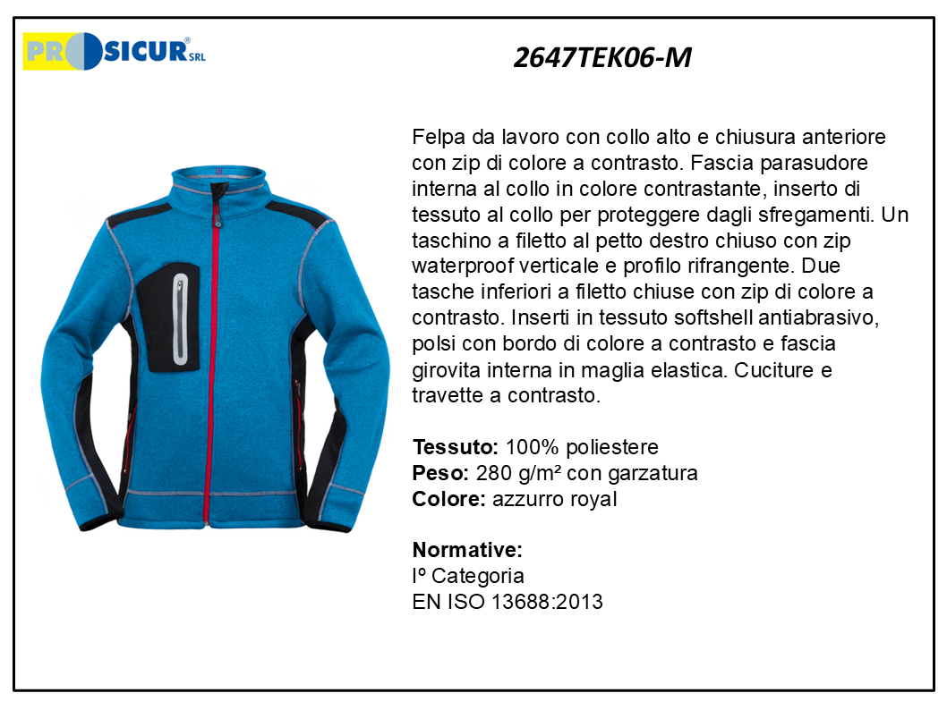 Felpa da lavoro 100% poliestere, 280 g/m² con garzatura, con collo alto e chiusura anteriore con zip di colore a contrasto. Fascia parasudore interna al collo in colore contrastante, inserto di tessuto al collo per proteggere dagli sfregamenti. Un taschino a filetto al petto destro chiuso con zip waterproof verticale e profilo rifrangente. Due tasche inferiori a filetto chiuse con zip di colore a contrasto. Inserti in tessuto softshell antiabrasivo, polsi con bordo di colore a contrasto e fascia girovita interna in maglia elastica. Cuciture e travette a contrasto. Iº Categoria EN ISO 13688:2013. Colore royal, taglia M