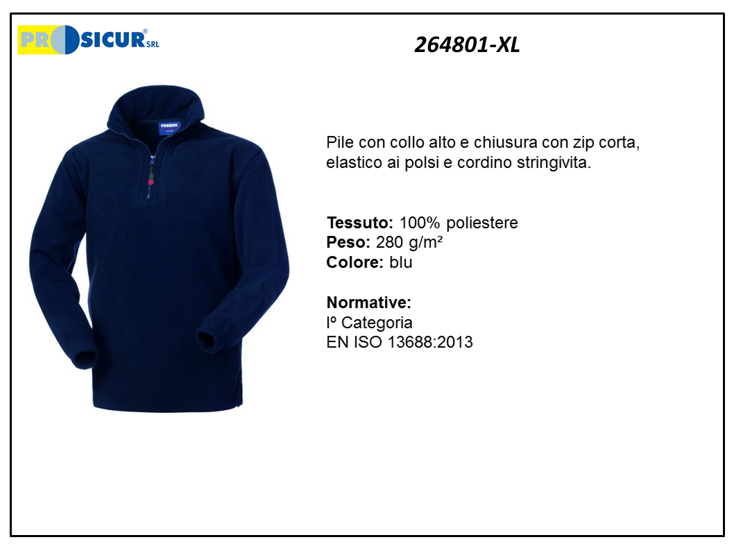 ile 100% poliestere 280 g/m², con collo alto e chiusura con zip corta, elastico ai polsi e cordino stringivita. Iº Categoria EN ISO 13688:2013. Colore blu, taglia XL
