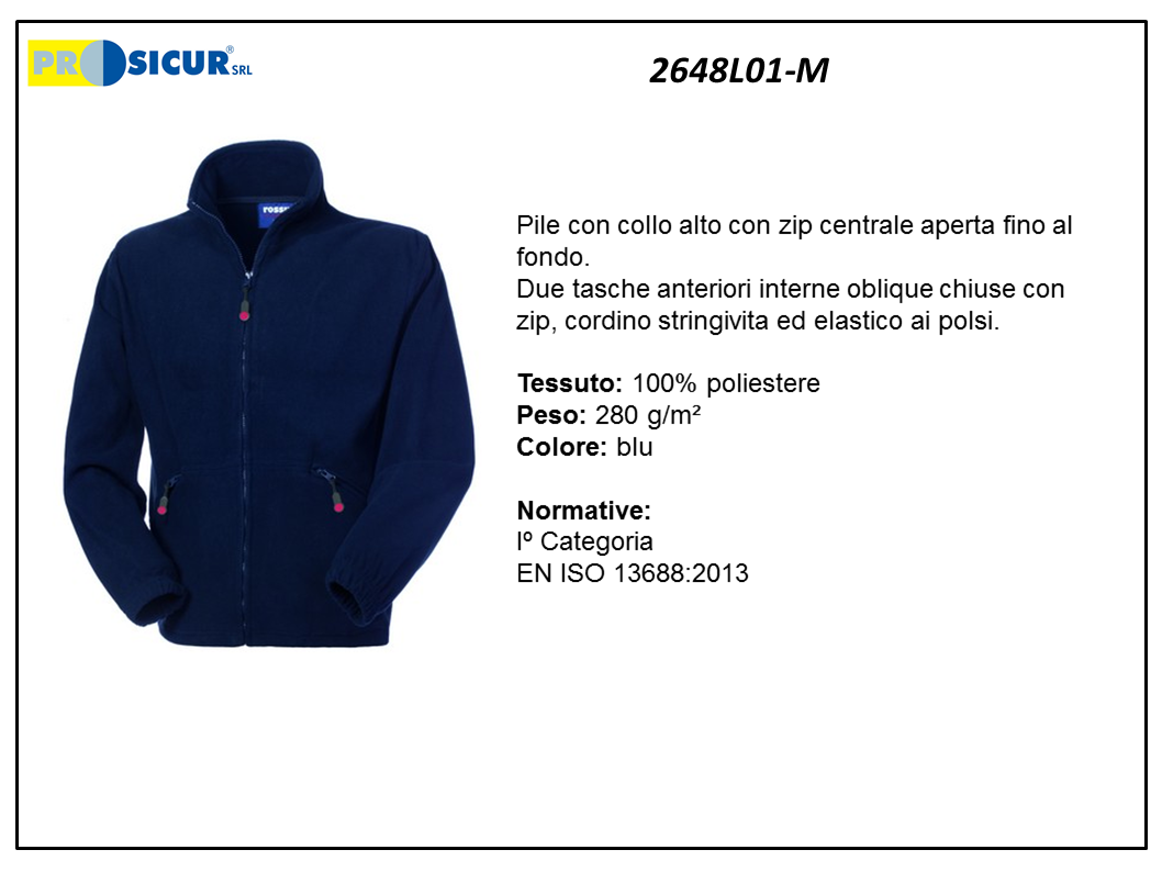 ile 100% poliestere 280 g/m², con collo alto con zip centrale aperta fino al fondo. Due tasche anteriori interne oblique chiuse con zip, cordino stringivita ed elastico ai polsi. Iº Categoria EN ISO 13688:2013. Colore blu, taglia M