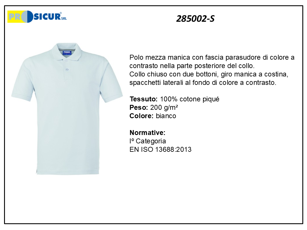Polo 100% cotone piqué, 200 g/m², mezza manica con fascia parasudore di colore a contrasto nella parte posteriore del collo. Collo chiuso con due bottoni, giro manica a costina, spacchetti laterali al fondo di colore a contrasto. Iº Categoria EN ISO 13688:2013. Colore bianco, taglia S