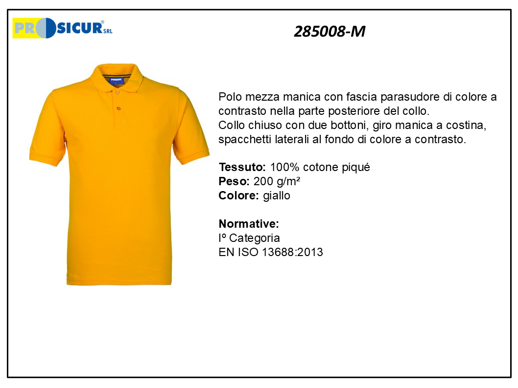 Polo 100% cotone piqué, 200 g/m², mezza manica con fascia parasudore di colore a contrasto nella parte posteriore del collo. Collo chiuso con due bottoni, giro manica a costina, spacchetti laterali al fondo di colore a contrasto. Iº Categoria EN ISO 13688:2013. Colore giallo, taglia M