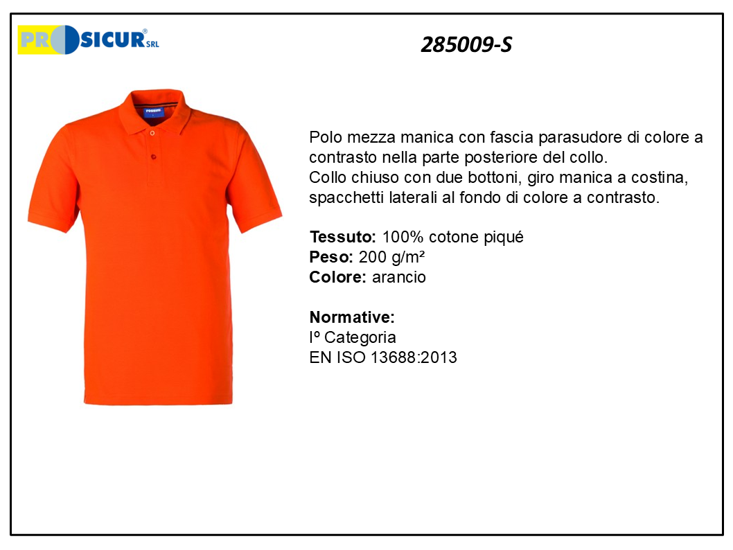 Polo 100% cotone piqué, 200 g/m², mezza manica con fascia parasudore di colore a contrasto nella parte posteriore del collo. Collo chiuso con due bottoni, giro manica a costina, spacchetti laterali al fondo di colore a contrasto. Iº Categoria EN ISO 13688:2013. Colore arancio, taglia S