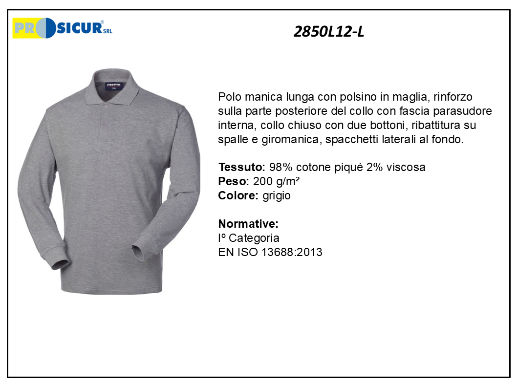 olo 98% cotone piqué 2% viscosa, 200 g/m², manica lunga con polsino in maglia, rinforzo sulla parte posteriore del collo con fascia parasudore interna, collo chiuso con due bottoni, ribattitura su spalle e giromanica, spacchetti laterali al fondo. Iº Categoria EN ISO 13688:2013. Colore grigio, taglia L