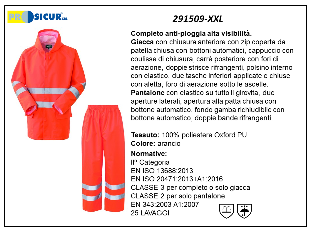Completo anti-pioggia alta visibilità, 100% poliestere Oxford PU, con doppie bande rifrangenti. IIº Categoria EN ISO 13688:2013 EN ISO 20471:2013+A1:2016 CLASSE 3 per completo o solo giacca CLASSE 2 per solo pantalone EN 343:2003 A1:2007. Colore arancio, taglia XXL