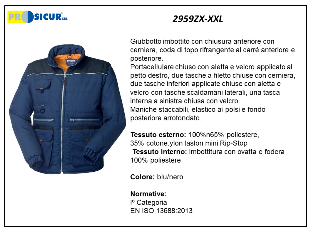 Giubbotto 65% poliestere, 35% cotone, imbottito con ovatta 100% poliestere, chiusura anteriore con cerniera, coda di topo rifrangente al carré anteriore e posteriore. Portacellulare Maniche staccabili, elastico ai polsi e fondo posteriore arrotondato.lare chiuso con aletta e velcro applicato al petto destro, due tasche a filetto chiuse con cerniera, due tasche inferiori applicate chiuse con aletta e velcro con tasche scaldamani laterali, una tasca interna a sinistra chiusa con velcro. Iº Categoria EN ISO 13688:2013. Colore blu/nero, taglia XXL