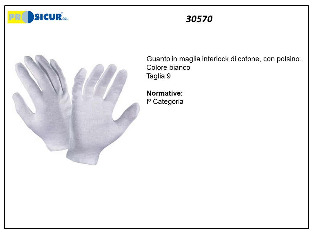Guanto in maglia interlock di cotone, con polsino. Colore bianco. Taglia 9