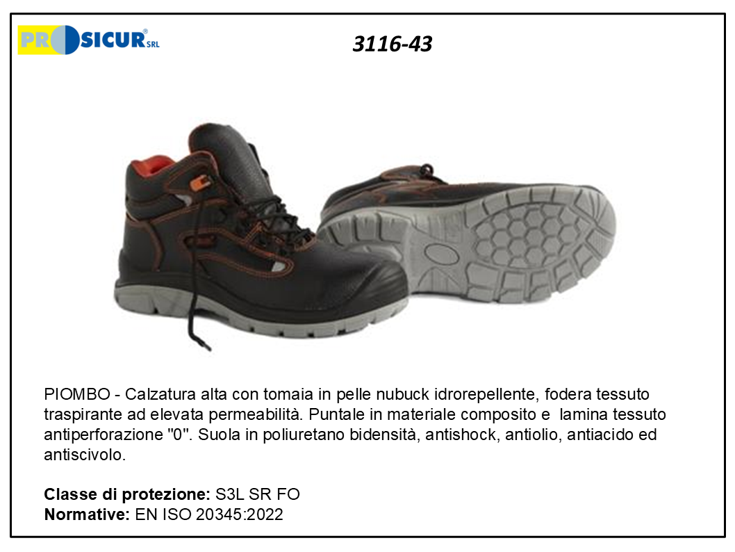 Calzatura PIOMBO alta con tomaia in pelle nubuck idrorepellente, fodera tessuto traspirante ad elevata permeabilità. Puntale in materiale composito e lamina tessuto antiperforazione ""0"". Suola in poliuretano bidensità, antishock, antiolio, antiacido ed antiscivolo. Taglia 43 S3L SR FO EN ISO 20345:2022"
