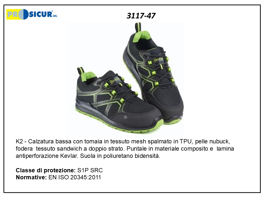 alzatura K2 bassa con tomaia in tessuto mesh spalmato in TPU, pelle nubuck, fodera tessuto sandwich a doppio strato. Puntale in materiale composito e lamina antiperforazione Kevlar. Suola in poliuretano bidensità. Taglia 47 S1P SRC EN ISO 20345:2011