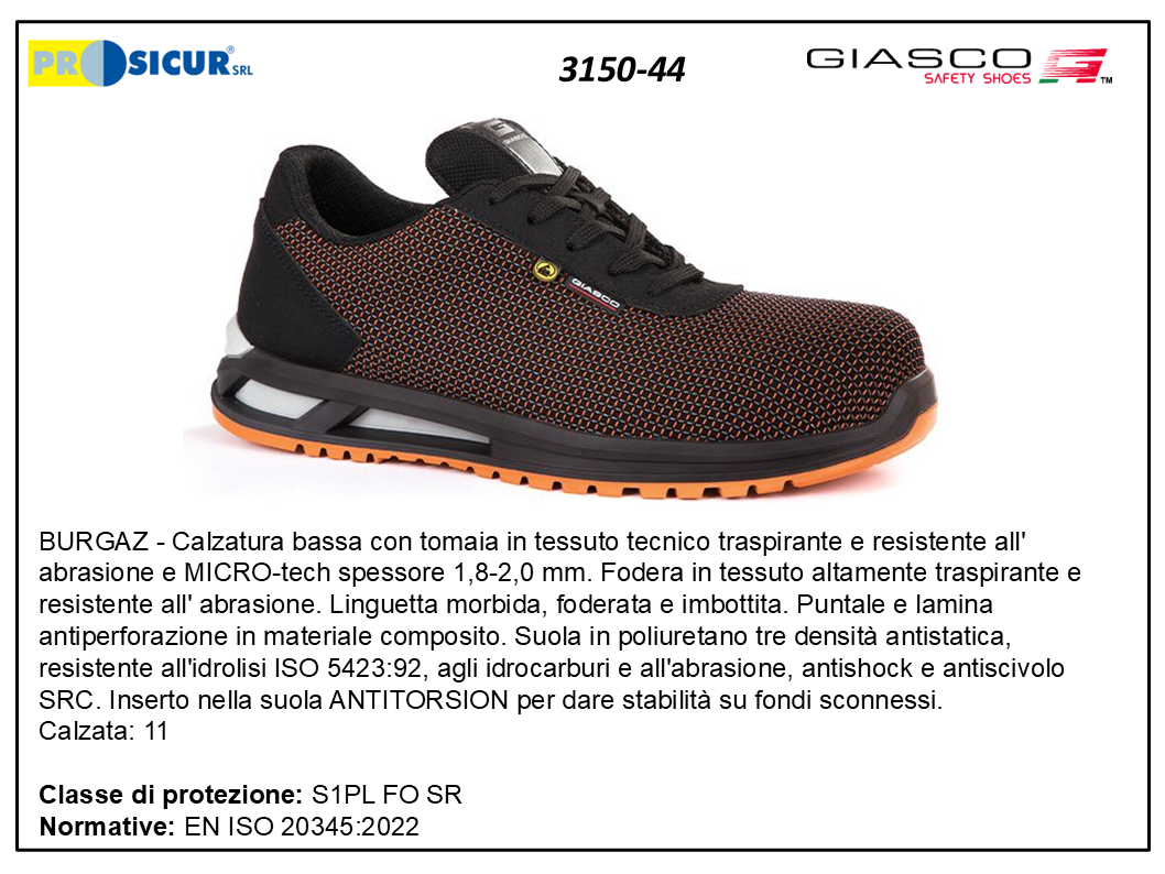 alzatura GIASCO BURGAZ bassa con tomaia in tessuto tecnico traspirante e resistente all’ abrasione e MICRO-tech spessore 1,8-2,0 mm. Fodera in tessuto altamente traspirante e resistente all’ abrasione. Linguetta morbida, foderata e imbottita. Puntale e lamina antiperforazione in materiale composito. Suola in poliuretano tre densità antistatica, resistente all’idrolisi ISO 5423:92, agli idrocarburi e all’abrasione, antishock e antiscivolo SRC. Inserto nella suola ANTITORSION per dare stabilità su fondi sconnessi. Calzata: 11 Taglia 44 S1PL FO SR EN ISO 20345:2022