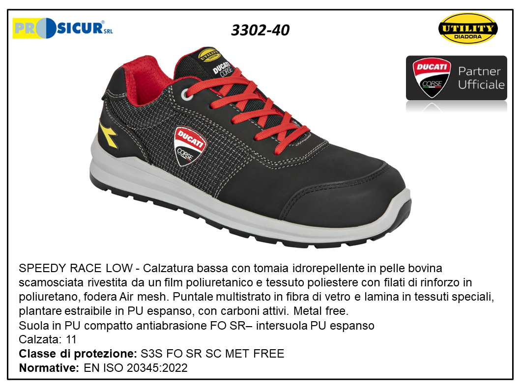 alzatura DIADORA SPEEDY RACE LOW bassa con tomaia idrorepellente in pelle bovina scamosciata rivestita da un film poliuretanico e tessuto poliestere con filati di rinforzo in poliuretano, fodera Air mesh. Puntale multistrato in fibra di vetro e lamina in tessuti speciali, plantare estraibile in PU espanso, con carboni attivi. Metal free. Personalizzazione DUCATI CORSE. Suola in PU compatto antiabrasione FO SR–intersuola PU espanso. Taglia 40 Calzata: 11 S3S FO SR SC MET FREE EN ISO 20345:2022