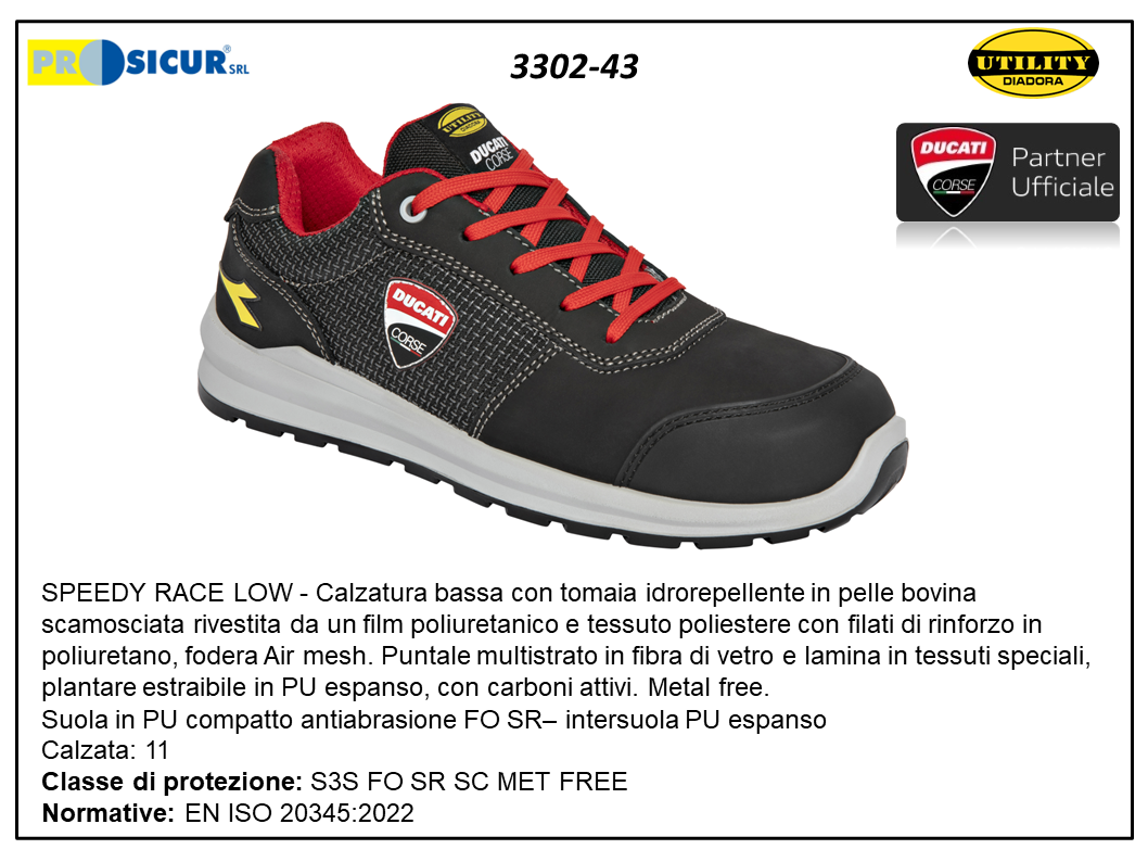alzatura DIADORA SPEEDY RACE LOW bassa con tomaia idrorepellente in pelle bovina scamosciata rivestita da un film poliuretanico e tessuto poliestere con filati di rinforzo in poliuretano, fodera Air mesh. Puntale multistrato in fibra di vetro e lamina in tessuti speciali, plantare estraibile in PU espanso, con carboni attivi. Metal free. Personalizzazione DUCATI CORSE. Suola in PU compatto antiabrasione FO SR–intersuola PU espanso. Taglia 43 Calzata: 11 S3S FO SR SC MET FREE EN ISO 20345:2022