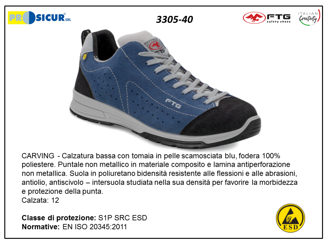 alzatura FTG CARVING bassa con tomaia in pelle scamosciata blu, fodera 100% poliestere. Puntale non metallico in materiale composito e lamina antiperforazione non metallica. Suola in poliuretano bidensità resistente alle flessioni e alle abrasioni, antiolio, antiscivolo – intersuola studiata nella sua densità per favorire la morbidezza e protezione della punta. Taglia 40 Calzata: 12 S1P SRC ESD EN ISO 20345:2011
