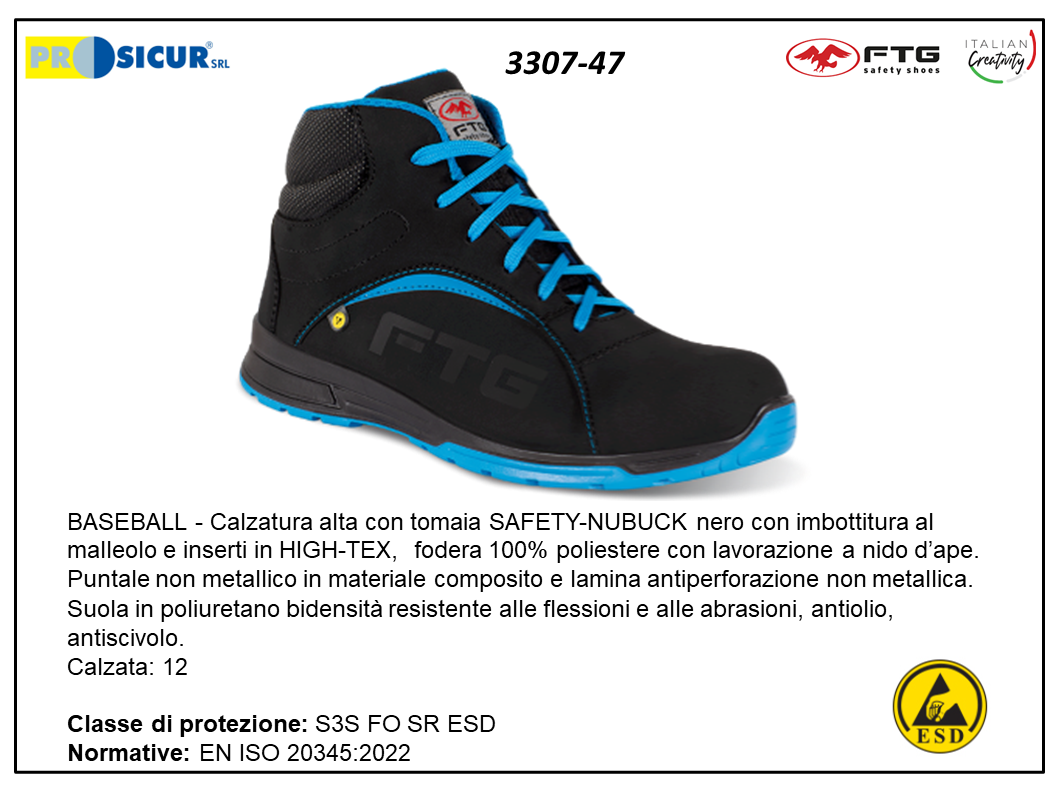 Calzatura FTG BASEBALL alta con tomaia SAFETY-NUBUCK nero con imbottitura al malleolo e inserti in HIGH-TEX, fodera 100% poliestere con lavorazione a nido dÂ’ape. Puntale non metallico in materiale composito e lamina antiperforazione non metallica. Suola in poliuretano bidensità resistente alle flessioni e alle abrasioni, antiolio, antiscivolo. Taglia 47 Calzata: 12 S3S FO SR ESD