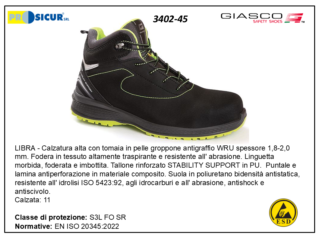 alzatura GIASCO LIBRA alta con tomaia in pelle groppone antigraffio WRU spessore 1,8-2,0 mm. Fodera in tessuto altamente traspirante e resistente all’ abrasione. Linguetta morbida, foderata e imbottita. Tallone rinforzato STABILITY SUPPORT in PU. Puntale e lamina antiperforazione in materiale composito. Suola in poliuretano bidensità antistatica, resistente all’ idrolisi ISO 5423:92, agli idrocarburi e all’ abrasione, antishock e antiscivolo. ESD Calzata: 11 Taglia 45 S3L FO SR EN ISO 20345:2022