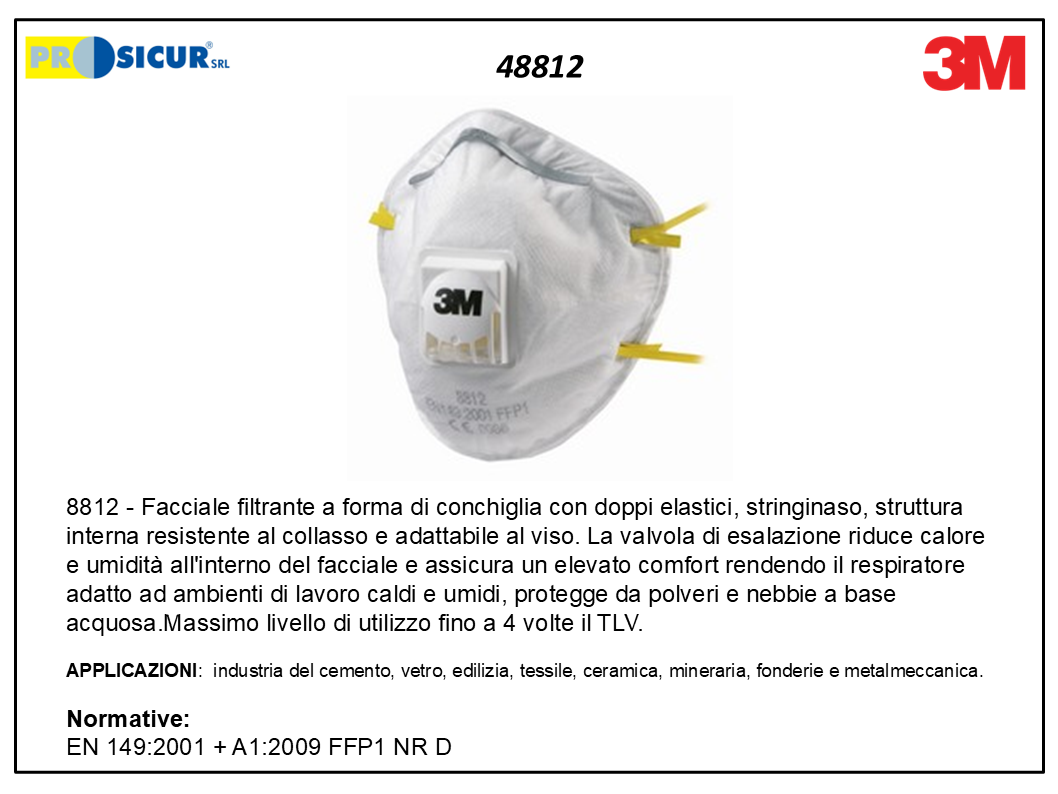 acciale filtrante 3M 8812 a forma di conchiglia con doppi elastici, stringinaso, struttura interna resistente al collasso e adattabile al viso. La valvola di esalazione riduce calore e umidità all’interno del facciale e assicura un elevato comfort rendendo il respiratore adatto ad ambienti di lavoro caldi e umidi, protegge da polveri e nebbie a base acquosa.Massimo livello di utilizzo fino a 4 volte il TLV. APPLICAZIONI: industria del cemento, vetro, edilizia, tessile, ceramica, mineraria, fonderie e metalmeccanica. EN 149:2001 + A1:2009 FFP1 NR D