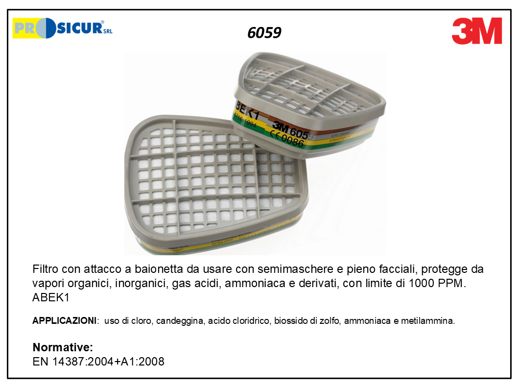 iltro 3M 6059 con attacco a baionetta da usare con semimaschere e pieno facciali, protegge da vapori organici, inorganici, gas acidi, ammoniaca e derivati, con limite di 1000 PPM. ABEK1 APPLICAZIONI: uso di cloro, candeggina, acido cloridrico, biossido di zolfo, ammoniaca e metilammina. EN 14387:2004+A1:2008