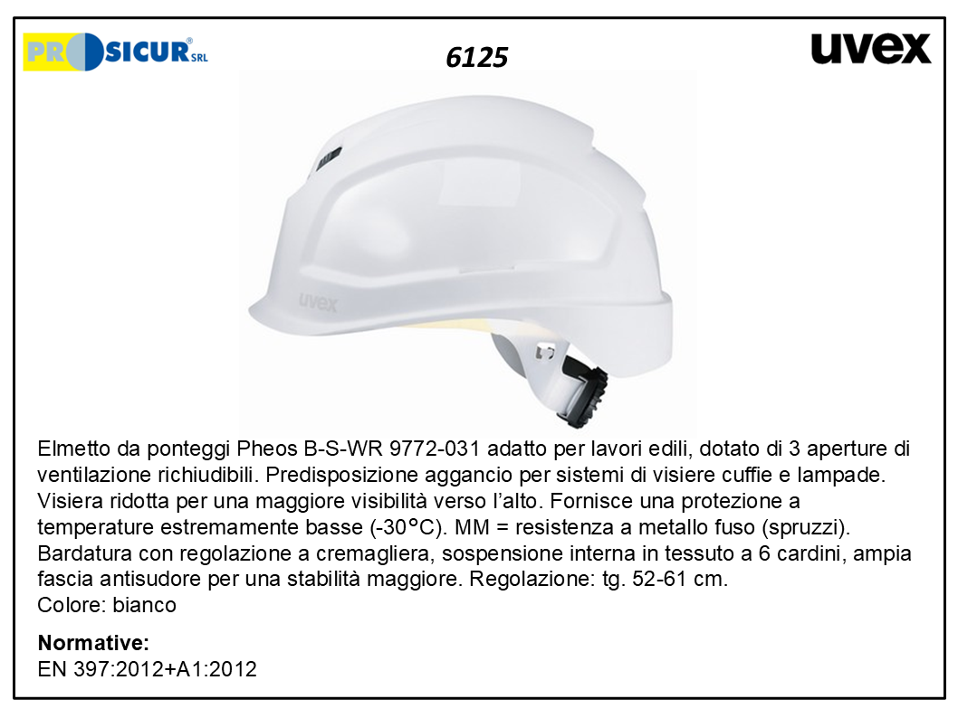 Elmetto da ponteggi UVEX Pheos B-S-WR 9772-031 adatto per lavori edili, dotato di 3 aperture di ventilazione richiudibili. Predisposizione aggancio per sistemi di visiere cuffie e lampade. Visiera ridotta per una maggiore visibilità verso lÂ’alto. Fornisce una protezione a temperature estremamente basse (-30°C). MM = resistenza a metallo fuso (spruzzi). Bardatura con regolazione a cremagliera, sospensione interna in tessuto a 6 cardini, ampia fascia antisudore per una stabilità maggiore. Regolazione: tg. 52-61 cm.