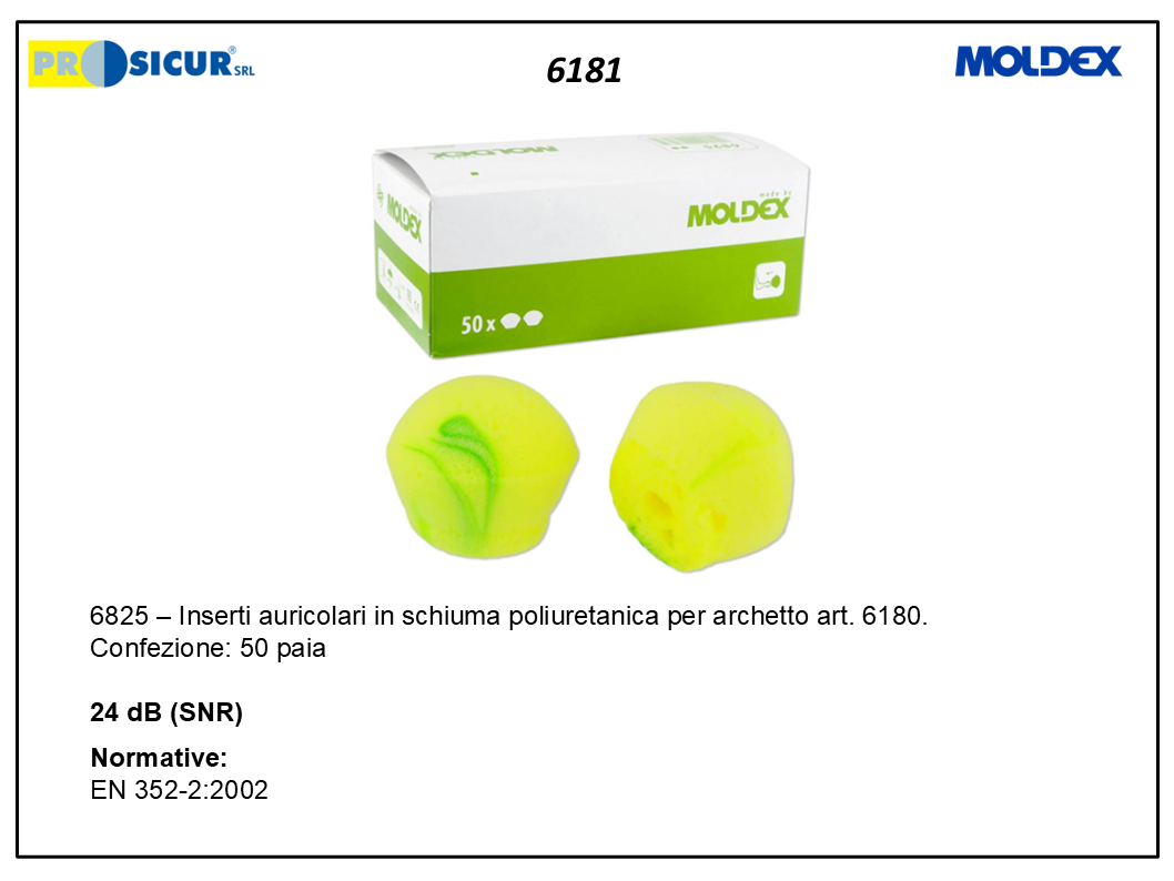 Inserti auricolari di ricambio MOLDEX 6825 in schiuma poliuretanica per archetto art. 6180. Confezione: 50 paia. 24 dB (SNR)