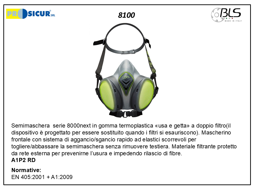 emimaschera BLS SERIE 8000NEXT in gomma termoplastica «usa e getta» a doppio filtro(il dispositivo è progettato per essere sostituito quando i filtri si esauriscono). Mascherino frontale con sistema di aggancio/sgancio rapido ad elastici scorrevoli per togliere/abbassare la semimaschera senza rimuovere testiera. Materiale filtrante protetto da rete esterna per prevenirne lÂ’usura e impedendo rilascio di fibre. A1P2 RD EN 405:2001 + A1:2009