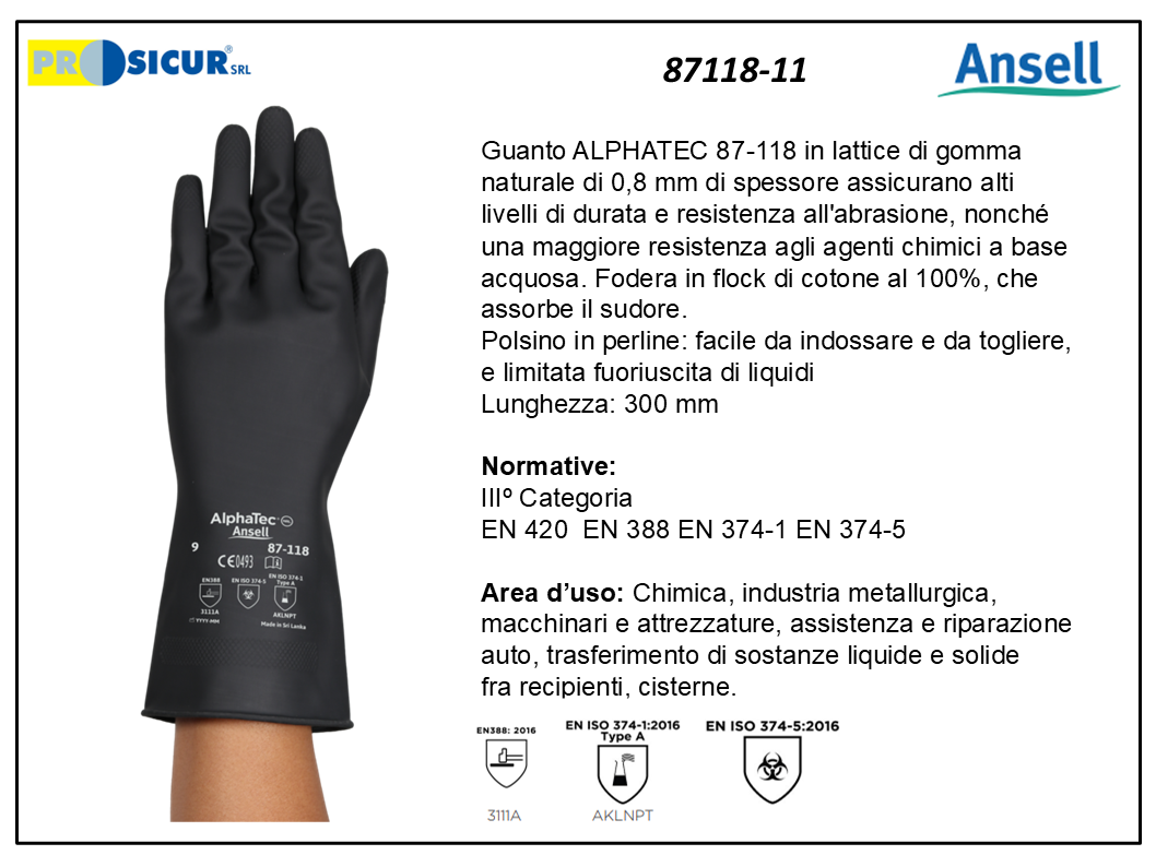 uanto ANSELL ALPHATEC 87-118 in lattice di gomma naturale di 0,8 mm di spessore assicurano alti livelli di durata e resistenza all’abrasione, nonché una maggiore resistenza agli agenti chimici a base acquosa. Fodera in flock di cotone al 100%, che assorbe il sudore. Polsino in perline: facile da indossare e da togliere, e limitata fuoriuscita di liquidi. Lunghezza: 300 mm Taglia 11 IIIº Categoria EN 420 EN 388 EN 374-1 EN 374-5
