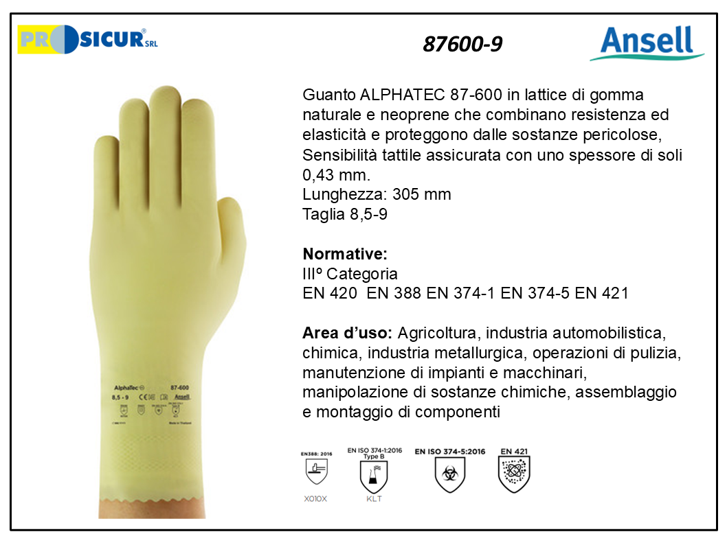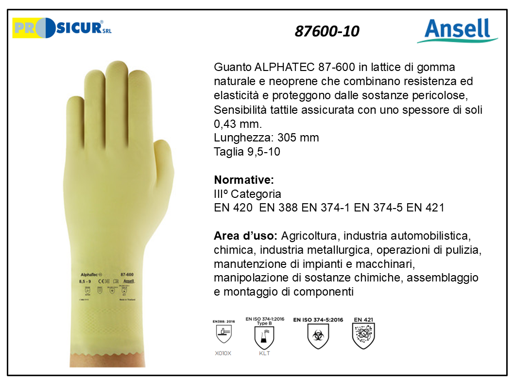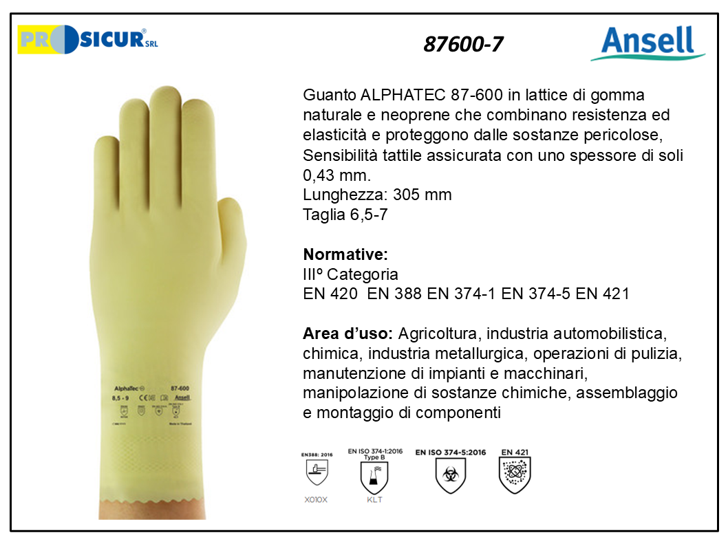 87600 – (Quantità per Confezione: 12 PA) – Guanto alphatec lattice gomma naturale e neoprene l305mm
