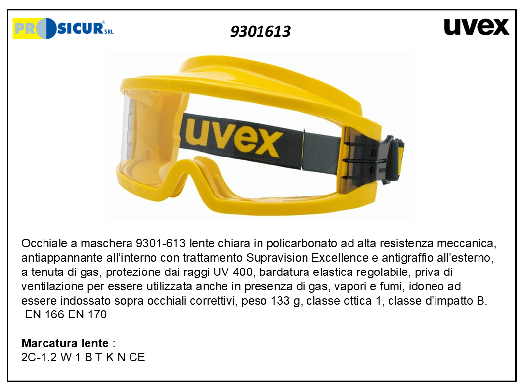 Occhiale UVEX a maschera 9301-613 lente chiara in policarbonato ad alta resistenza meccanica, antiappannante allÂ’interno con trattamento Supravision Excellence e antigraffio allÂ’esterno, a tenuta di gas, protezione dai raggi UV 400, bardatura elastica regolabile, priva di ventilazione per essere utilizzata anche in presenza di gas, vapori e fumi, idoneo ad essere indossato sopra occhiali correttivi, peso 133 g, classe ottica 1, classe dÂ’impatto B. EN 166 EN 170
