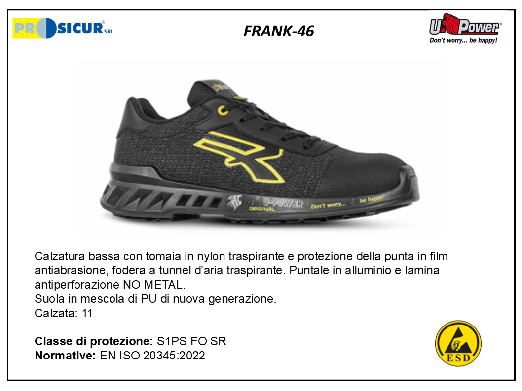 Calzatura U-POWER FRANK bassa con tomaia in nylon traspirante e protezione della punta in film antiabrasione, fodera a tunnel dÂ’aria traspirante. Puntale in alluminio e lamina antiperforazione NO METAL.