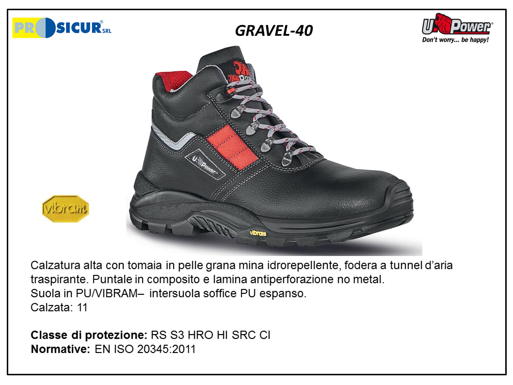 Calzatura U-POWER GRAVEL alta con tomaia in pelle grana mina idrorepellente , fodera a tunnel dÂ’aria traspirante. Puntale in composito e lamina antiperforazione NO METAL.
