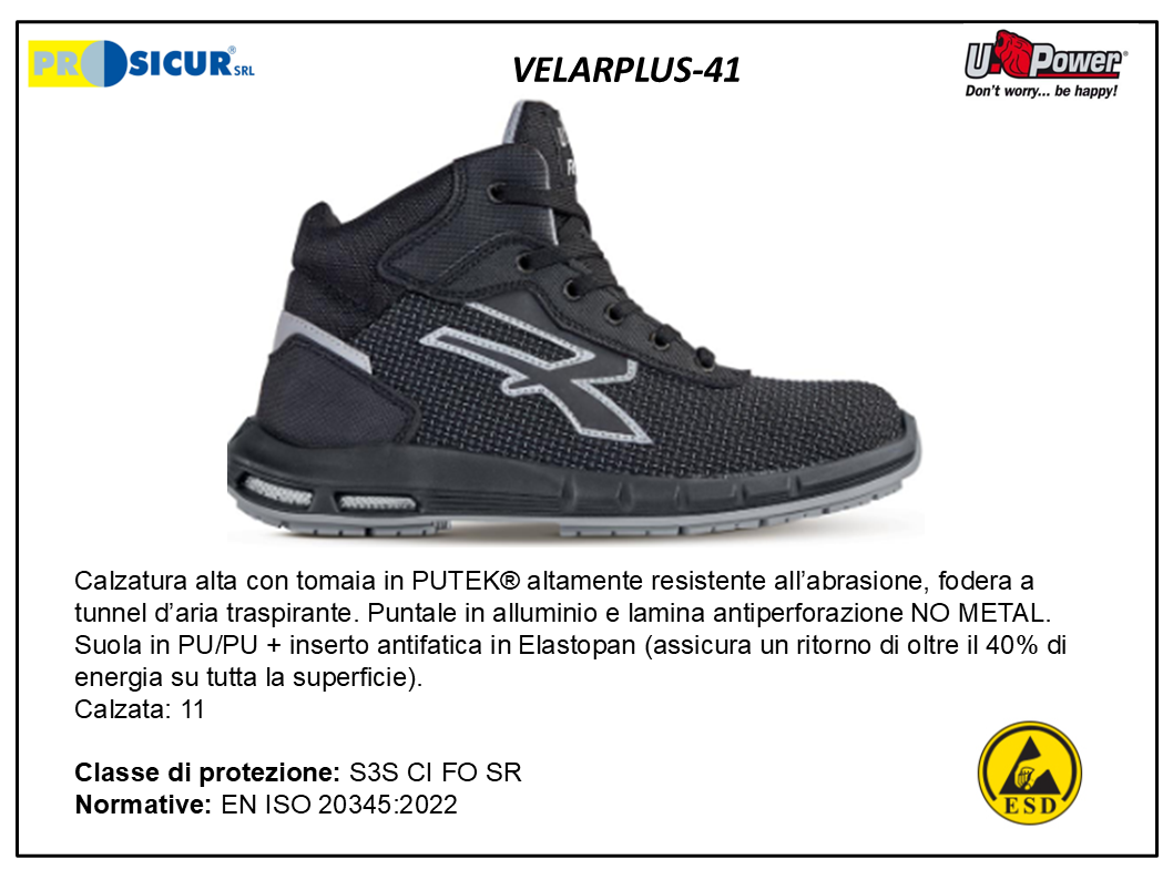 Calzatura U-POWER VELAR PLUS alta con tomaia in PUTEK® altamente resistente allÂ’abrasione, fodera a tunnel dÂ’aria traspirante. Puntale in alluminio e lamina antiperforazione NO METAL.